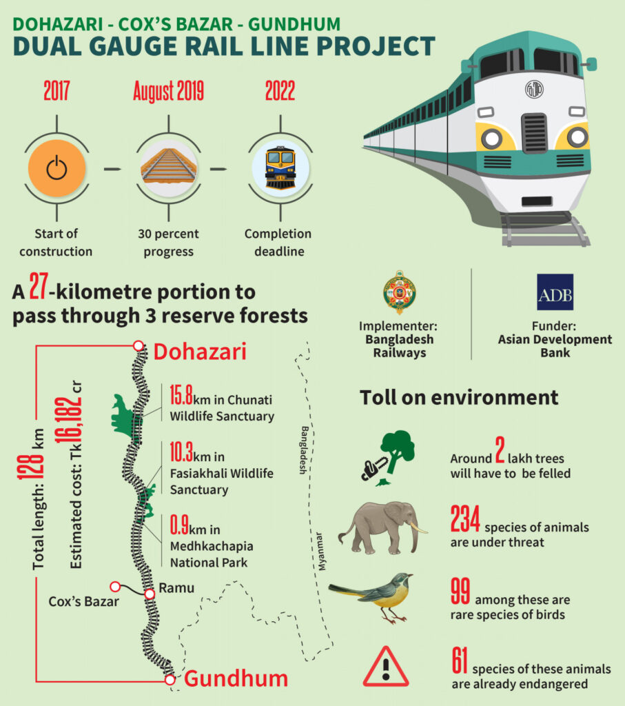 The railway route passes through 27 kilometers of forest areas—15.8 km in Chunati, 10.3 km in Fasiakhali, and 0.9 km in Medhakachapia. Construction will require the felling of approximately 200,000 trees, with plans to replant 700,000 trees later. However, environmentalists caution that replantation cannot compensate for immediate habitat loss and fragmentation.