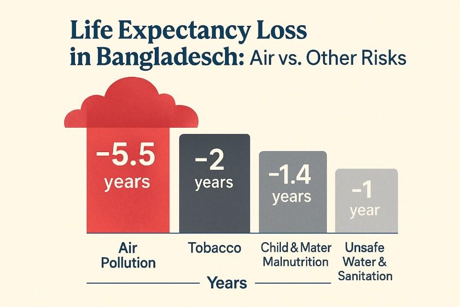 Air pollution remains South Asia’s deadliest health threat, with Bangladesh, India, Nepal, and Pakistan suffering extreme PM2.5 levels. Bangladeshis lose 5.5 years of life, Delhi residents 8.2 and underscoring urgent regional action to curb dirty air.