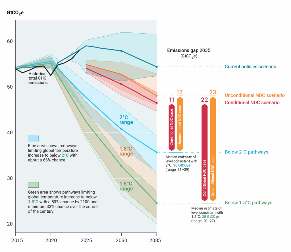 Figure 2: Global emissions could fall 12% by 2035 with new NDC commitments (Source: UNFCC, 2025).